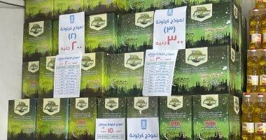 1- كرتونة بسعر 150 جنيهًا تضم 7 أصناف (كيلو سكر – كيلو أرز – صلصة 300 جرام – 2 مكرونة أنواع 350 جرام – عبوة زيت 700 مللي - شاي 40 جرام – 2 ملح 300 جرام).