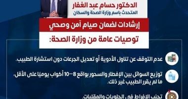 أكد الدكتور حسام عبد الغفار المتحدث الرسمي باسم وزارة الصحة والسكان، مجموعة من الإرشادات الصحية المهمة لضمان صيام آمن وصحي، في إطار حرص الوزارة على تعزيز الوعي الصحي بين المواطنين مع اقتراب شهر رمضان.