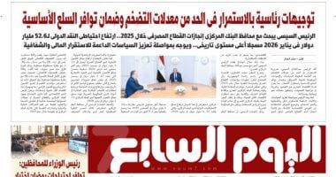 ينشر "اليوم السابع" فى عدده الصادر غدا، تفاصيل هامة حول العديد من الأحداث الجارية على الساحتين الداخلية والخارجية أبرزها: .. توجيهات رئاسية بالاستمرار فى الحد من معدلات التضخم وضمان توافر السلع الأساسية.. رئيس الوزراء للمحافظين: توافر احتياجات رمضان اختبار عملى مبكر لأداء كل محافظ.. الذهب يرتفع %1.3 فى البورصة العالمية بسبب التوترات والأونصة تقفز فوق 5108 دولارات