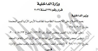 نشرت الجريدة الرسمية، قرار وزارة الداخلية رقم 234 لسنة 2026، بشأن التصديق على نتيجة انتخابات أعضاء مجلس إدارة بطريركية الأرمن الأرثوذكس بالقاهرة، وهيئة مكتب مجلس الإدارة، لمدة عامين متتاليين تبدأ من 28 نوفمبر الماضي وحتي 27 نوفمبر 2027، وفقا للائحة النظامية للطائفة.