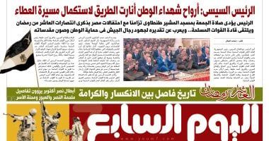 تحت عنوان "أرواح شهداء الوطن أنارت الطريق لاستكمال مسيرة العطاء"، ترصد اليوم السابع في عددها المطبوع الصادر غدا السبت، أداء الرئيس عبد الفتاح السيسى صالة الجمعة بمسجد المشير طنطاوى تزامنا مع احتفالات مصر بذكرى انتصارات العاشر من رمضان.