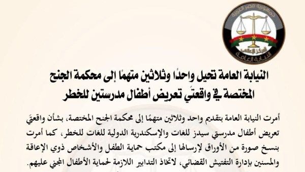 أحالت النيابة العامة 31 متهما إلى المحاكمة أمام محكمة الجنح المختصة، بشأن واقعتي تعريض أطفال مدرستي "سيدز للغات" و"الإسكندرية الدولية للغات" للخطر.