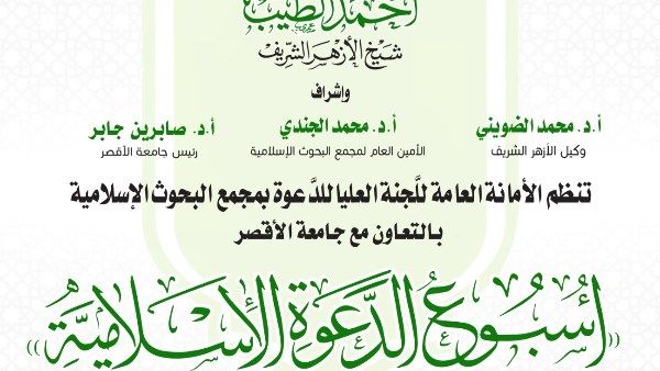 ينظِّم مجمع البحوث الإسلامية، الأحد المقبل، فعاليَّات الأسبوع السابع عشر للدَّعوة الإسلاميَّة، الذي تعقده اللجنة العُليا لشئون الدَّعوة في جامعة الأقصر تحت عنوان: (وعيٌ يبني وأصالةٌ تحفظ)، برعايةٍ كريمةٍ مِنْ فضيلة الإمام الأكبر أ.د. أحمد الطيِّب، شيخ الأزهر الشريف، وإشراف فضيلة أ.د. محمد الضويني، وكيل الأزهر، وفضيلة أ.د. محمد الجندي، الأمين العام لمجمع البحوث الإسلاميَّة.