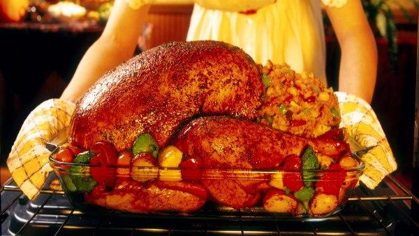 -إدخال مقياس حرارة اللحوم في أسمك جزء من الفخذ لمعرفة ما إذا كان الديك الرومي قد نضج.