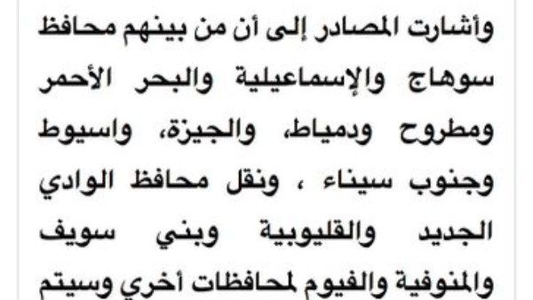 ورحيل محافظ البحر الأحمر والجيزة ودمياط وجنوب سيناء ومطروح وأسيوط وسوهاج.