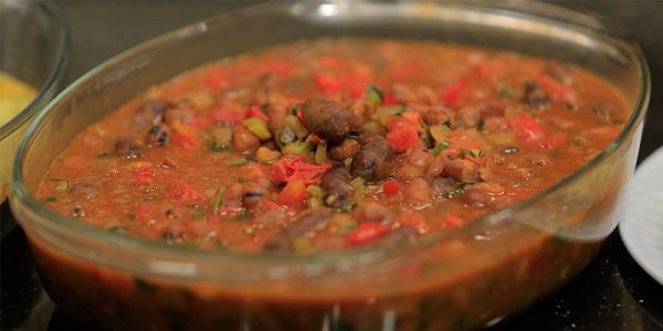 اضيفي الفلفل والطماطم والصلصة والفول والشبت ويقلب ويقدم.