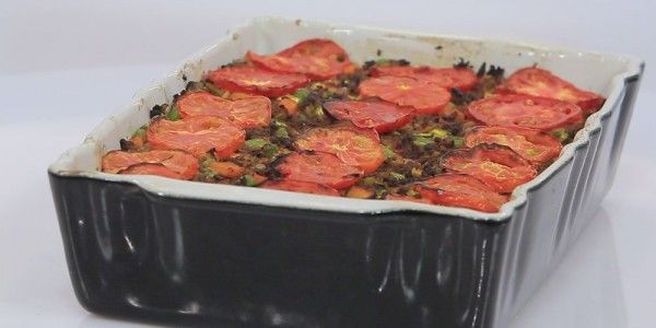 قلبي كل الخليط ثم ضعيه في طاجن في الفرن ويمكن أن تزينيه بشرائح الطماطم واتركيه حتى تمام النضج وقدميه ساخنا.