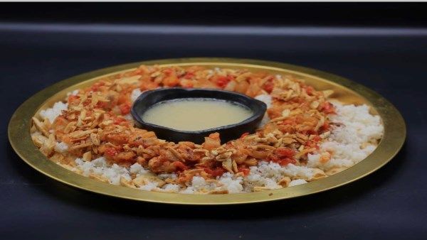 في طبق التقديم يوضع العيش البلدي المحمص ثم الأرز والكوارع وصوص الصلصة.