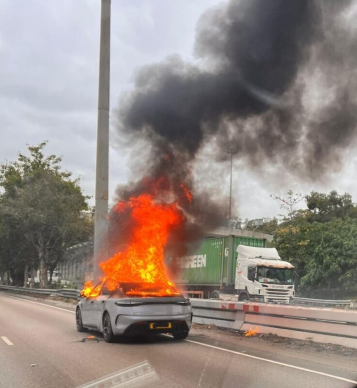 اندلعت النيران في سيارة سيدان كهربائية فضية من طراز بي واي دي سيل (BYD Seal) على طريق توين مون رود في هونغ كونغ بسبب باور بانك كان على مقعد الراكب.