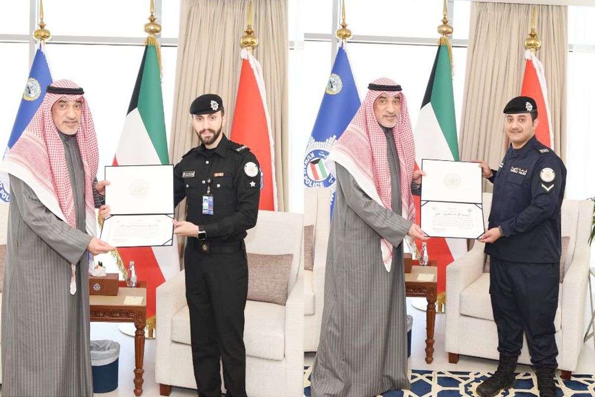 وشمل التكريم وكيل العريف محمد صقر المطيري، لضبطه حالة محاولة شخص الخروج من البلاد بطريقةغير مشروعة في منفذ النويصيب، ووكيل ضابط يوسف وليد الرشيدي لضبطه جواز سفر أجنبي مزور في مطار الكويت الدولي.