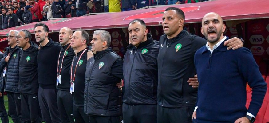 وليد الركراكي مدرب منتخب المغرب رفقة طاقمه الفني المساعد (X/EnMaroc)