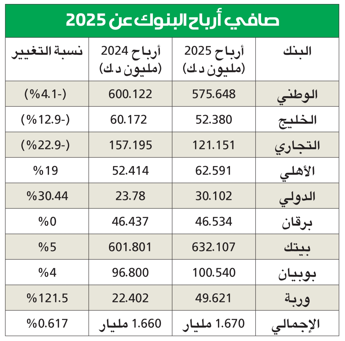 أغلق القطاع المصرفي نتائجه المالية على صافي أرباح عن العام الماضي 2025 بواقع 1.670 مليار دينار، مقارنة بــ 1.660 مليار عن العام المقابل 2024، بزيادة قدرها 10.252 ملايين وبنسبة نمو 0.617%.