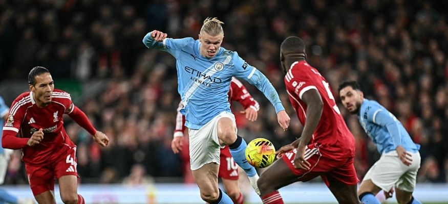 إيرلينغ هالاند مهاجم مانشستر سيتي في مواجهة ليفربول (Getty)