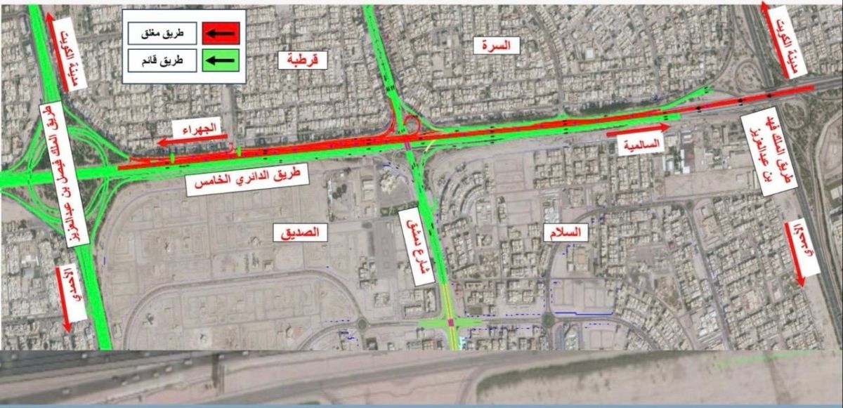 أعلنت وزارة الأشغال العامة بالتعاون مع الإدارة العامة للمرور عن الإغلاق المؤقت لطريق الدائري الخامس باتجاه الجهراء من تقاطعه مع طريق الملك فهد بن عبدالعزيز (طريق 40) حتى تقاطعه مع طريق الملك فيصل بن عبدالعزيز (طريق 50) لاستكمال أعمال تركيب اللوحات الإرشادية العلوية