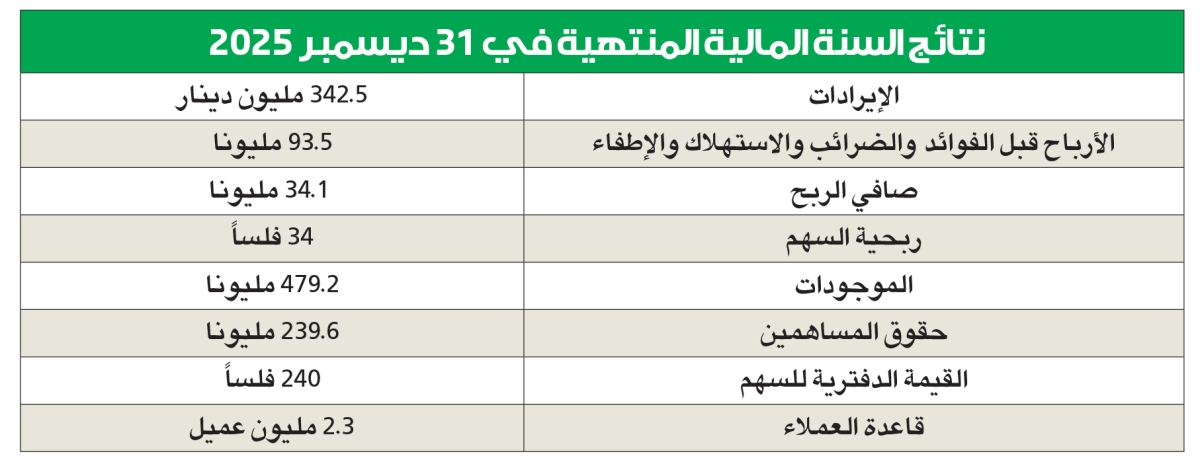 وبين أن صافي الربح، بلغ 34.1 مليون دينار (ربحية السهم 34 فلساً) بنسبة نمو بلغت 8.7% خلال 2025، مقارنة بـ31.4 مليون دينار (ربحية السهم 31 فلساً) في 2024. ويعكس هذا الأداء المالي المرن نجاح الشركة في إدارة التكاليف، وتحقيق التوازن بين النمو في جودة الأعمال واقتناص فرص الاستثمار المستقبلية الواعدة، إلى جانب الاستفادة من التحول الرقمي المتسارع في السوق المحلي والمنطقة.