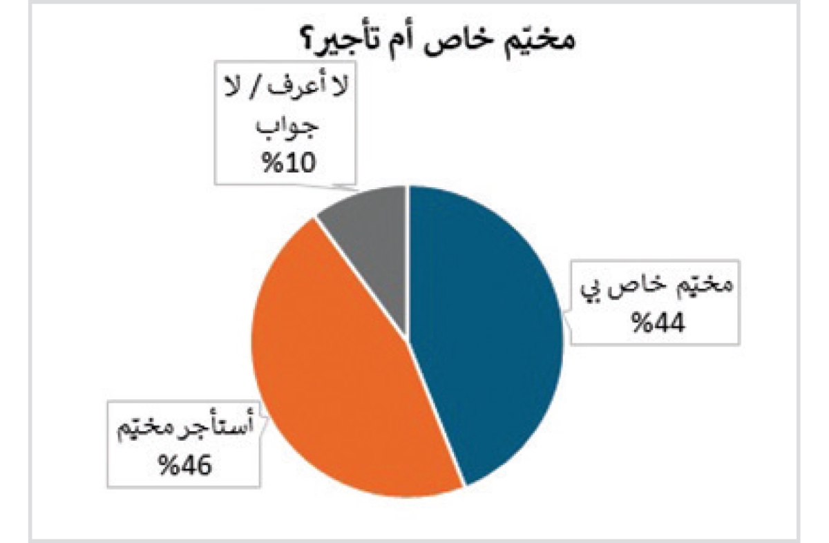 ويبدو أن تملّك مخيّم خاص أو استئجاره أمر قليل التأثير في الرغبة بالتخييم، والدلالة على ذلك أن نسبة 46 بالمئة من المخيّمين يستأجرون أماكن للتخييم (40 بالمئة من الكويتيين - 55 بالمئة من المقيمين العرب) مقابل 44 بالمئة يتوجهون إلى مخيمهم الخاص (52 بالمئة من الكويتيين - 32 بالمئة من المقيمين العرب). وفي التفاصيل، برزت فئة الدخل 3849- 2850 د. ك، كأكثر من يملك مخيماً خاصاً (83 بالمئة منهم) مقارنة بفئات الدخل الأخرى، أكانت أدنى أم أعلى.