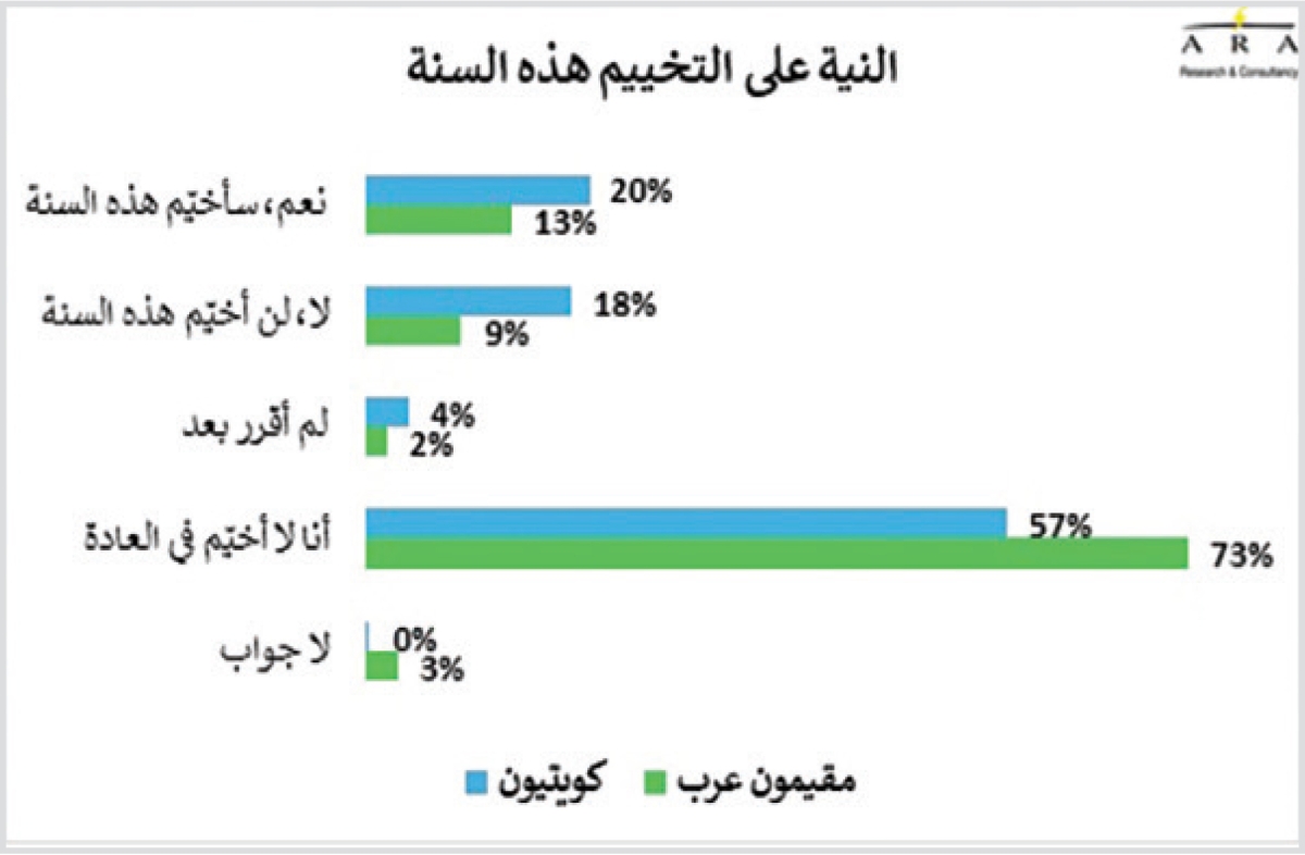 وبما أن التخييم بات يجذب المقيمين العرب أيضاً، فقد ذكرت نسبة 13 بالمئة منهم أنهم سيخيّمون هذا العام، و9 بالمئة لن يخيّموا، و2 بالمئة لم يقرروا بعد، أما أغلبيتهم العظمى (73 بالمئة) فاعتبرت أن التخييم ليس من عاداتها.