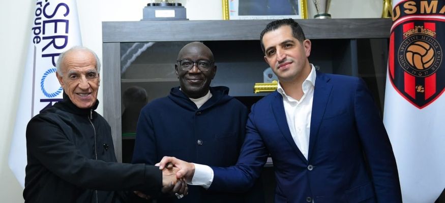 من مراسم توقيع المدرب السنغالي لامين ندياي لعقده مع اتحاد العاصمة الجزائري (X/USMAofficiel)