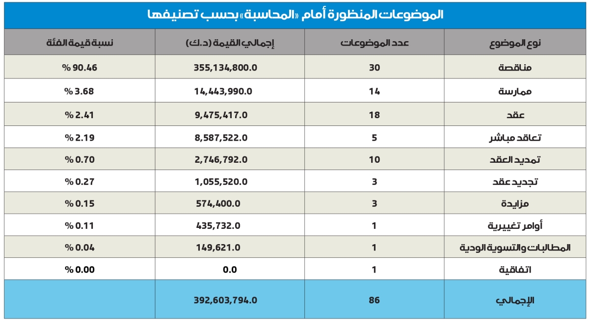 وفي إحصائية أعدتها «الجريدة»، أظهرت أن عدد المناقصات بلغ 29 موضوعا، أي ما نسبته 34.12 في المئة من إجمالي عدد الموضوعات قيد الدراسة، وبقيمة إجمالية تبلغ 355 مليون دينار، ما يمثل 90.46 في المئة من إجمالي القيمة، فيما بلغت قيمة الممارسات 14.4 مليونا بما نسبته 3.6 في المئة بعدد 14 موضوعا، تلاها 18 عقدا بقيمة إجمالية 9.4 ملايين بنسبة 2.4 في المئة، لتتوزع بقية الأمور التعاقدية على بقية المواضيع الأخرى، من تعاقد مباشر بـ8.5 ملايين، وتمديد العقد بـ2.7 مليون، وتجديد عقد بقيمة مليون دينار، وغيرها.