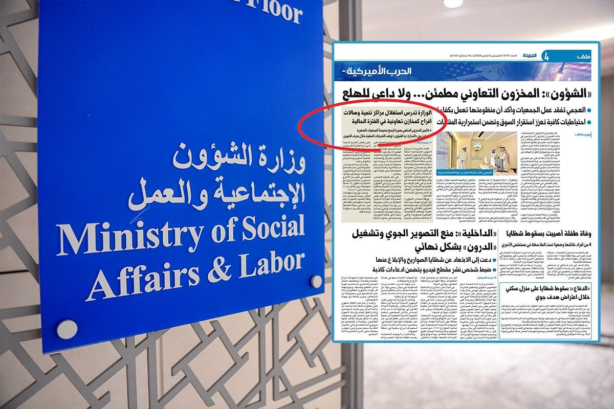 تأكيداً لخبر «الجريدة» المنشور في عددها الصادر اليوم بعنوان («الشؤون» تدرس استغلال مراكز تنمية وصالات أفراح كمخازن تعاونية في الفترة الحالية) والذي أشارت خلاله إلى «درس الوزارة استغلال بعض مراكز التنمية وصالات الأفراح كمخازن تعاونية في الفترة الحالية، ليتسنى استيعاب أكبر قدر ممكن من السلع والمواد الغذائية والاستهلاكية، لاسيما في منطقتي الفردوس وعبدالله المبارك، تحسباً لأي طارئ، وفي ظل الأوضاع الإقليمية الراهنة، وما قد يترتب عليها من تعطل أو تأخر وصول الإمدادات الغذائية».